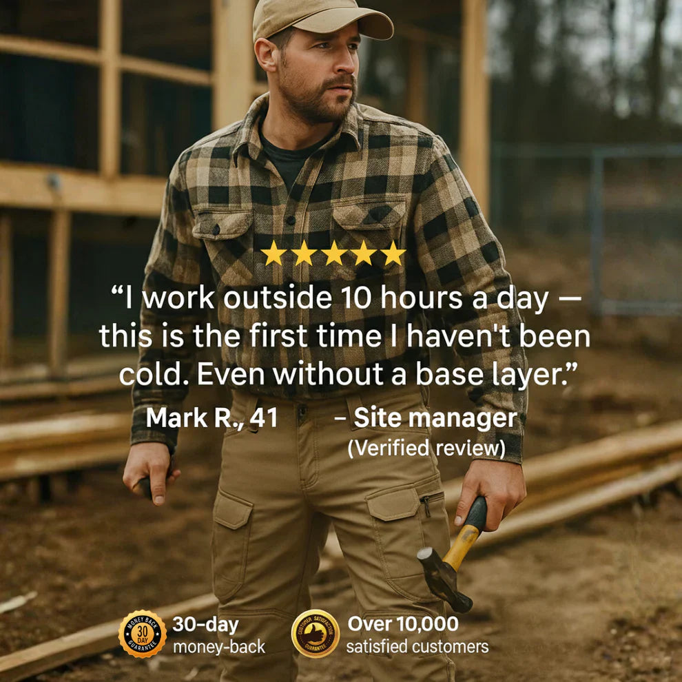 You’re lifting, kneeling, working — and your legs feel warm but breathable. No stiffness. No freezing denim. No wet thermals.